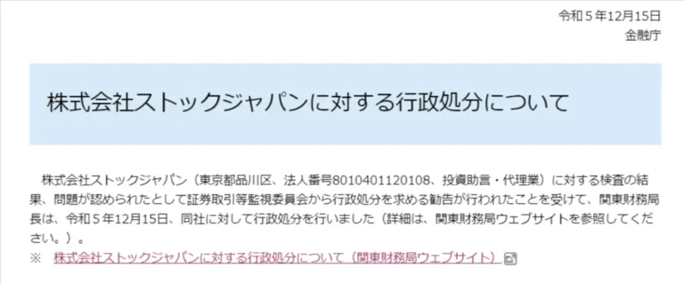 株式会社ストックジャパンの行政処分についてより詳しい内容を、別記載にて調査しまとめています。