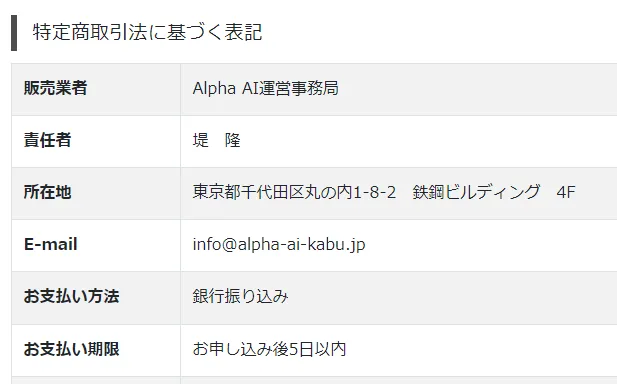 Alpha AI運営事務局も、その法律に則って表記をしているとのだと思いますが、気になる点がありました。